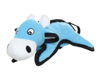 The Tuffy Junior Cow is a durable, yet soft toy for dogs of all sizes. The Tuffy Junior Cow is made with multiple layers of material that are bonded and sewn together to make one "Tuff" Layer. Each toy is then stuffed with safe, non-toxic fiber and sewn with multiple rows of stitching for extra strength and durability. The Tuffy Junior Cow has a squeaker, sewn inside a protective pouch, for your dog's safety and to provide hours of fun and entertainment. Tuffy dog toys can also float and are best used as interactive play toys and not chew toys. Machine wash / Air dry.