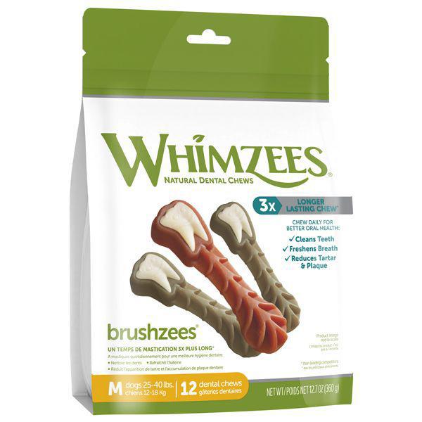 Whimzees Brushzees Dental Dog Chews (formerly known as Toothbrush Star) are edible toothbrushes perfect for snack time, playtime, and brush time all at the same time! Medium 4.25"L size is good for medium breed dogs 25-40 lbs. Made in Holland.