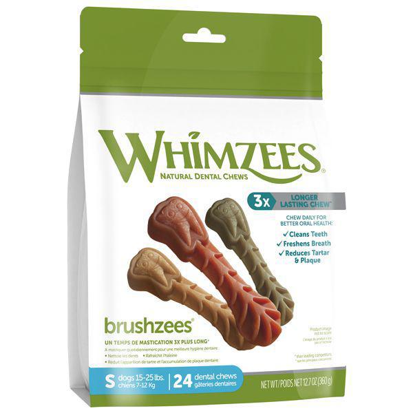 Whimzees Brushzees Dental Dog Chews (formerly known as Toothbrush Star) are edible toothbrushes perfect for snack time, playtime, and brush time all at the same time! Small 3.5"L size good for small breed dogs 15-25 lbs. Made in Holland.