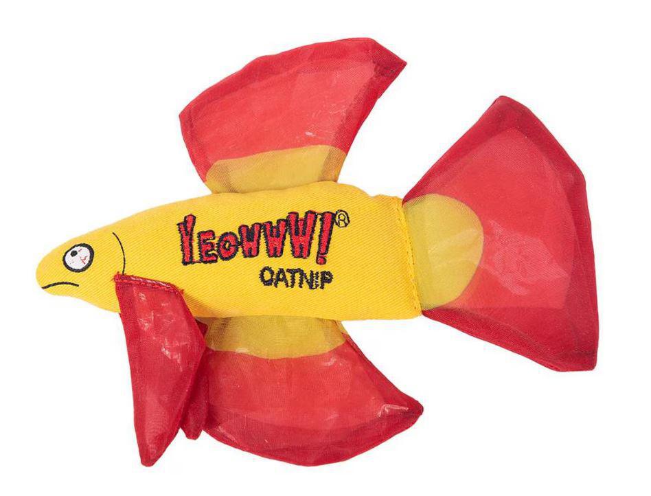 Calling all fans of fancy-finned, carefree freshwater fighting fish. Your cat's playtime will scale new heights with these fun fish freshly stuffed with organically grown catnip. Made of a durable cotton twill body right here in the USA. Crinkle fabric adds a fun little crunch to the experience. From tip to tail, each betta fish is 6.5" long and comes in one of three colors: blue, purple or red. Relax, no tank needed!