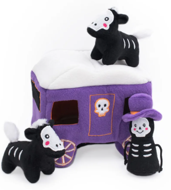 Playtime gets a little creepy and cute with the Halloween Burrow® Haunted Carriage! Just stuff the trio of haunting Miniz into the Haunted Carriage and sit back and watch as your dog works to find them all. Once your pup has all the squeaky Miniz out, they’ll be begging you to put them back in again and again for hours of fun!